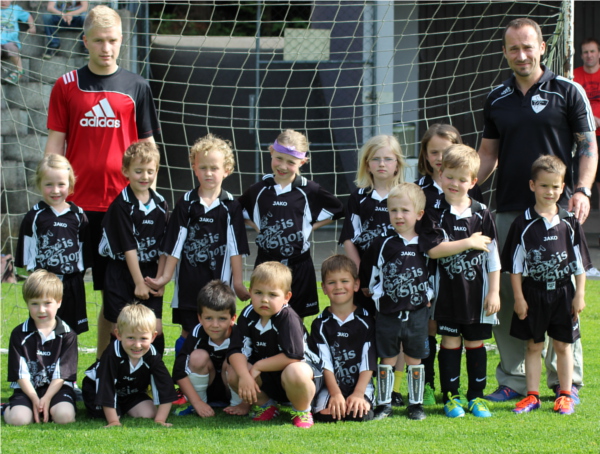 Von den Spielern und Eltern heiß ersehnt, war es am Freitag, 23. Mai 2014 endlich soweit. Stolz präsentierten sich die Spieler der “Minis”, der jüngsten Mannschaft des SVF, in ihren Schwarz-Weißen Dressen und warteten voll Ungeduld auf den Spielbeginn. Die Uhr zeigte exakt 17:10 Uhr als Schiri Michi Meier das erste Freundschaftsspiel des Teams anpfiff. Vier Mädels und zehn Buben stellten sich dem Heimspiel gegen die “Knirpse” aus Schardenberg. Man musste als Zuschauer staunen, was die Trainer Alexandro Salibasic und Stefan Gimplinger mit Unterstützung einer weiblichen Assistentin ihren Schützlingen bereits an Ballgefühl beigebracht haben. Das Spiel entwickelte sich offensiv, Freinberg bestimmte, Schardenberg setzte immer wieder ansehnliche Gegenangriffe. Zur Pause führten die SVF’ler mit 4:1-Toren, am Ende stand es 8:1. Unsere Jüngten bejubelten ihren Traumstart und feierten wie die Großen. Schardenberg war ein Gegner auf Augenhöhe, der wie die Freinberger noch viele Topchancen liegen ließ. Die Zuschauer waren begeistert und waren sich sicher die SVF-Kampfmannschaft des Jahres 2030 gesehen zu haben. Jugendleiter Schimek Bernhard und Vereinsboss Pretzl Hermann gratulieren den erfolgreichen Neulingen.