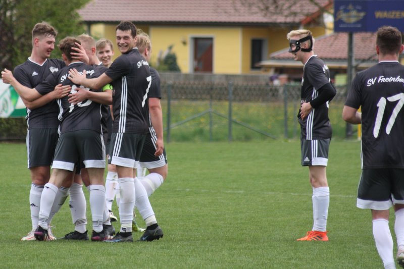Freinberg beginnt diese, für uns richtungsweisende Partie, im Vorwärtsgang. Der Matchball, den der ehemalige Freinberger Rudi Wenny stiftete, wurde zum Glücksbringer. Das Team war mit dem Anpfiff präsent, aggressiv und setzte auf ständiges Pressing. Die erste Chance haben jedoch die Gastgeber, nach einem langen Pass wird unser Goalie umspielt, aber Hofer David ist zur Stelle und kratzt die Kugel von der Linie. Im Gegenzug zieht Tomm aus 17 Metern volley ab, der Torwart ist aber rechtzeitig zur Stelle. In der 11. Minute zieht David Cerveny unwiderstehlich über rechts bis zur Grundlinie, sein Pass in den 16er verfehlen gleich drei Waizenkirchner, Poucek Josef nutzt das Geschenk und setzt das Leder aus 11 Metern unbedrängt zum umjubelten 1:0 ins Netz. Nur wenige Sekunden später zieht Ratzinger Tobias in den Strafraum, er kann, obwohl er dabei gleich dreimal zum Zug kommt, nichts Zählbares aus diesen Situationen machen. Besser macht es Waizenkirchen im Gegenzug. Ein Fehler unseres Keepers Kevin Haidinger, der für den verhinderten Kasbauer Patrick zwischen den Pfosten steht, bringt den Ausgleich. Wohlgemerkt, der einzige Fehler von Kevin an diesem Tag, danach bügelte er diesen bei einigen “Hundertprozentigen” großartig aus. Nach 18 Minuten MUSS das Führungstor fallen. Cereny “klaut” am 16er den Ball, ein perfekter Querpass auf Poucek, der jedoch aus 15 Meter das leere Tor nicht trifft. Später stehen bei ihm glelich vier Tore zu Buche. Freinberg spielt auch weiterhin in allen Mannschaftsteilen stark, sicher und mit tollem Einsatz. In der 32. Minute landet ein trockener Schuss aus 18 Metern am SVF-Pfosten, der Nachschuss geht in die Wolken. Unmittelbar danach eine Traumkombination. Lausberger, Tomm und Lang spielen im 16er perfekt auf. Jakob Lang setzt das Ei schließlich aus 12 Metern zum 2:1 ins Tor. Und nur zwei Minuten später dürfen unsere Jungs erneut jubeln. Das Spielgerät wird am 16er abermals “gestohlen”, Cerveny spielt wieder wunderbar quer auf Poucek, der aus fünf Metern keine Mühe hat auf 3:1 zu stellen. Ein Traum. Fünf Minuten vor dem Pausenpfiff folgt ein Klassepass von der Eckfahne aus auf Lausberger, der am 5er Eck im letzten Moment geblockt wird. Das wäre ein “Gusterlstückerl” gewesen. Bis hier hin, ist unser Team “Herr im fremden Haus”.